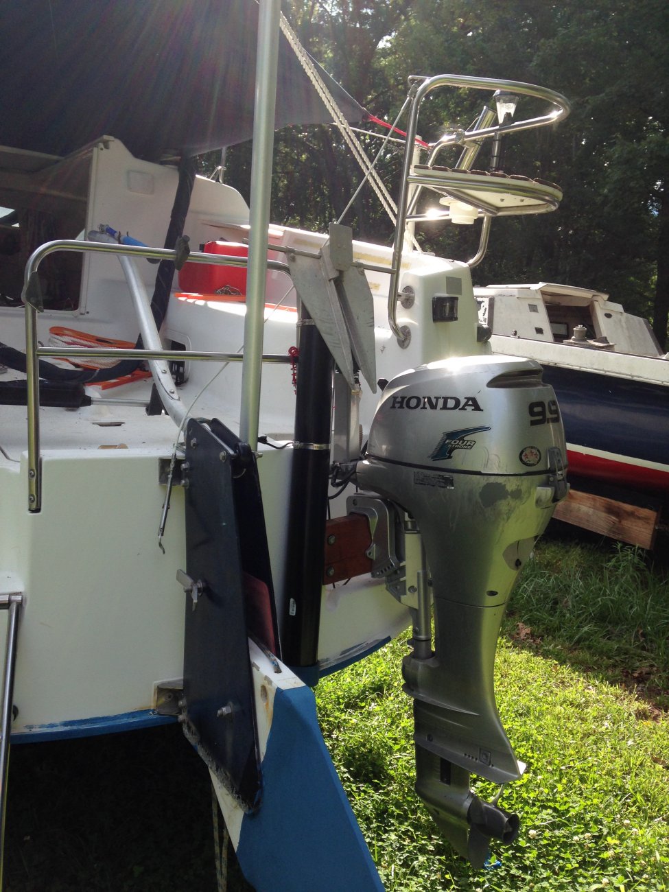 I turned hard to starboard, motor on full and got the wind at our back. Tried to ride the waves in and use the motor to give us some control of what direction. Any control of the ship was illusionary. I did get the wind to our back. The waves, in a lake, were higher then the sides of the boat from peak to trough. They were not washing the deck somehow but they were picking up the transom and lifting the motor out of the water. It would roar every time. With the motor out of the water the wind would catch us and try to spin us. First to port then starboard then back again. The motor would dip back in and catch the water and I would get a second of control then nothing again. The bow was oscillating back and forth in front of me at what felt like 45 degree sweeps. This was too much for the motor mount. The outboard decided to abandon ship. Crack and the motor was gone. And with it any pretend ability to control the boat. We went to starboard and now had the wind and waves coming starboard and rolling us to port. With out the solar panel we were not heeling as much, though still very far.