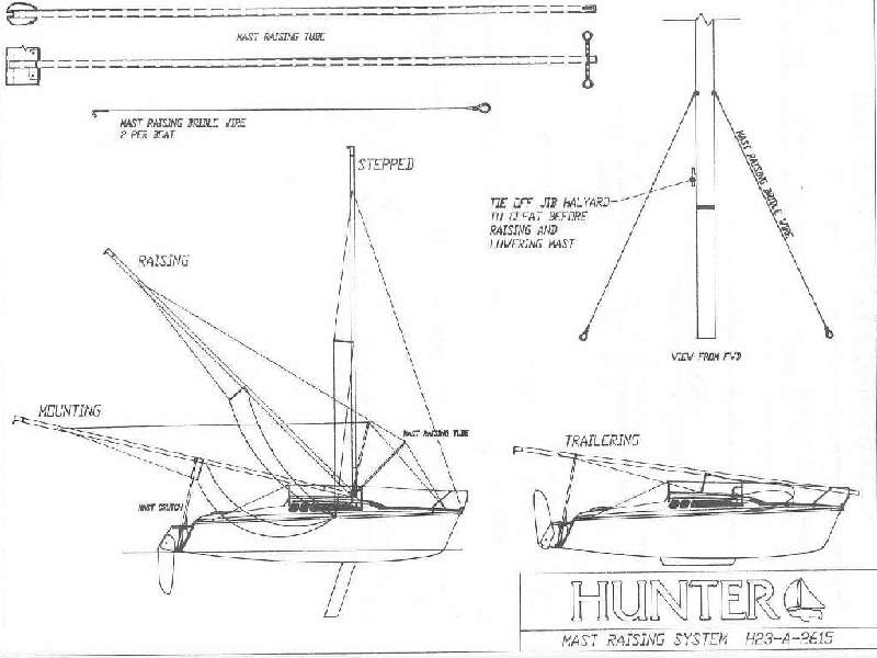 I have a 1986 H23 that I've owned since 1988. The first few mast raising incidents using Hunter's instructions were awful. I'm a small guy and I singlehand, so I needed a system that would allow me to raise the stick by myself without getting a back injury. I put together a very simple mast-raising system that allows me to raise and lower the mast by myself. Once I have everything in place, I stand near the tabernacle and raise the mast without ever having to leave that spot. I've used this system about 4 times each year for several years now. The system consists of a 8 foot long gin-pole made of 3" aluminum pipe (I've seen guys use a piece of 4"x4" lumber as well). This pins into a padeye I installed near the base of the mast using one of the tabernacle pins. At the other end of the ginpole, I have a couple of eyebolts to attach the forstay and my mainsheet tackle, which I have removed from the cockpit. At this end of the pole, I also have tied a couple of 12 ft long 1/4-inch dacron lines that will be used to steady the ginpole. I bought a new mainsheet that is long enough to allow me to get all the way back to the cockpit with the end of the mainsheet (about 75' of line will do). This is all I use. It doesn't provide quite the side to side support that an A-frame does, but it might be a little more portable. In fact, I often raise and lower the mast with the boat in the water. Here is the step-by-step mast raising procedure that I've used for the last 2 or 3 dozen mast steppings. You can also let the stick down by reversing this method. 1. Take your time. It helps to have a spotter make sure that your backstay doesn't get hung on something, and that the shrouds pull straight as you raise the mast. My 8 year old son is my spotter. If I feel any unusual resistance, I cleat the mainsheet and look around to see what the problem is. 2. Remove the rudder and install the yoke in the raised position. I installed a roller in my yoke so I can walk the mast back while holding onto the base end. Walk the mast aft until the base is even with the tabernacle. Install the aft mast pin into the tabernacle. 3. Pin the forestay to one end of the ginpole. Clip the mainsheet tackle to that same end. Clip the other end of the mainsheet to the jib tack pendant in the anchor well. Let the two 1/4" dacron lines hang free. Now pin the other end of the pole into the padeye near the base of the mast using a bolt or tabernacle pin. 4. You should have a pair of lifeline stanchions that are somewhat in line with the tabernacle. Tie or clip the 1/4" dacron lines into the base of the port and starboard stanchion bases. The pole should stand up by itself now. 5. I now take the free end of the mainsheet and wrap it around the winch on the side of the mast. I stand there and pull on the mainsheet with my right hand while I keep the mast steady with my left. If the boat is level and it's not very windy I don't have much problem with side to side motion. I continue to pull the mainsheet until the mast is nearly vertical (or the mainsheet tackle is fully closed). Cleat the mainsheet, which is now supporting the mast. 6. Now take the jib halyard and attach it to something solid (I use the cleat in the anchor well). Go back to the mast and pull the jibsheet tight to get the mast vertical. Cleat the jibsheet at the mast. The jibsheet is now supporting the mast until you can unpin the forestay from the ginpole and properly attach it to the boat. 7. If side-to-side motion is a problem, I sometimes use my halyards for support. Just before raising the mast, I clip my main halyard to the starboard stanchion base near the tabernacle. I clip the jib halyard to the port stanchion base. I snug and cleat each of these halyards on the mast. This seems to give enough support to keep the mast from going over the side. This is what works for me. I'm sure other sailors will have their own methods that work for them. If you need photos, reply to me and I'll send you some. Good Luck. Dan Bickford S/V Charlie Weaver