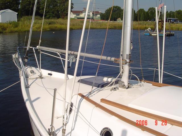 What you can probably do right now is make up a set of bridles out of rope to go from the end of your boom to connect into the top of your turnbuckles on each side which are closest to the bow of your boat and more in line aftwartships to your mast. Jeff, one of our yacht club members who has an O'Day 25 without triangular plates on his stays, does this and it seems to work for him. You may need to loosen or disconnect the other two stays, I'm not certain. Check your mast raising directions for more info on that. What really complicates this whole procedure is the furler. You need someone to hold and guide it with the mast as it goes up or down. Always have the wind coming directly from the bow when you raise/lower from the bow and make sure that the boat is level. A wind coming from the side could blow the mast over.