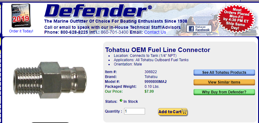 To be up front, I do have a horse in this race.I went looking for a male 1/4 quick disconnect for my Tohatsu O.B. fuel line and this is what I found...
