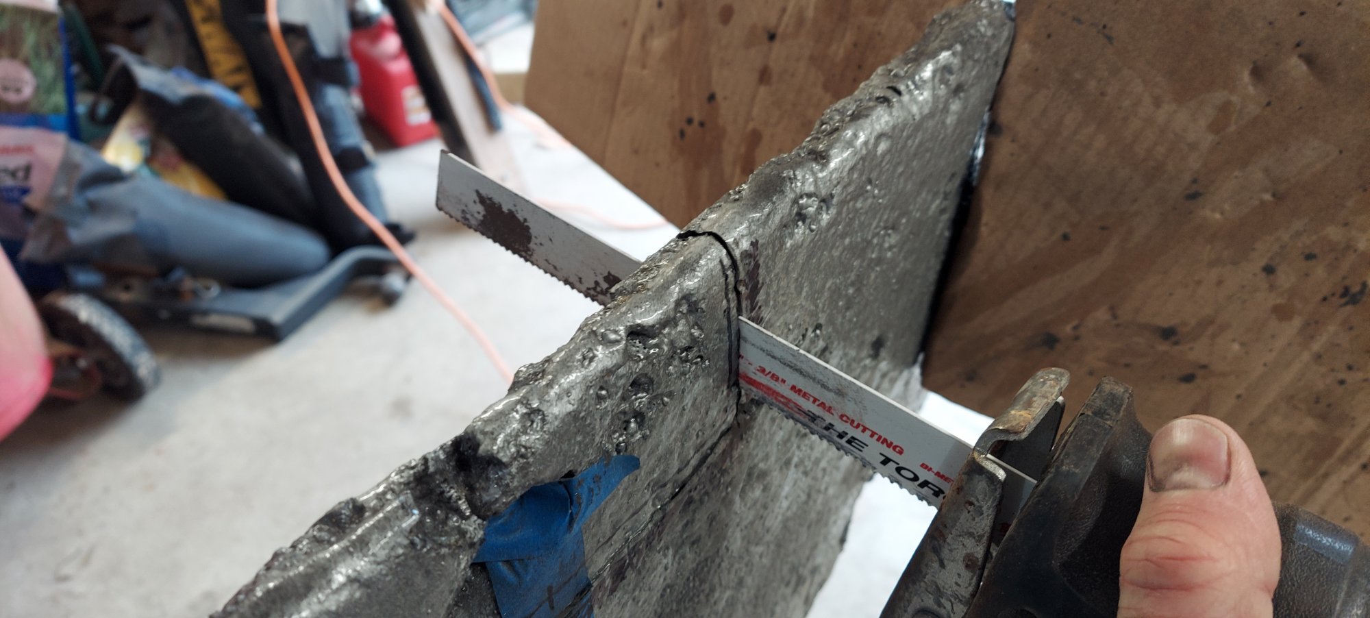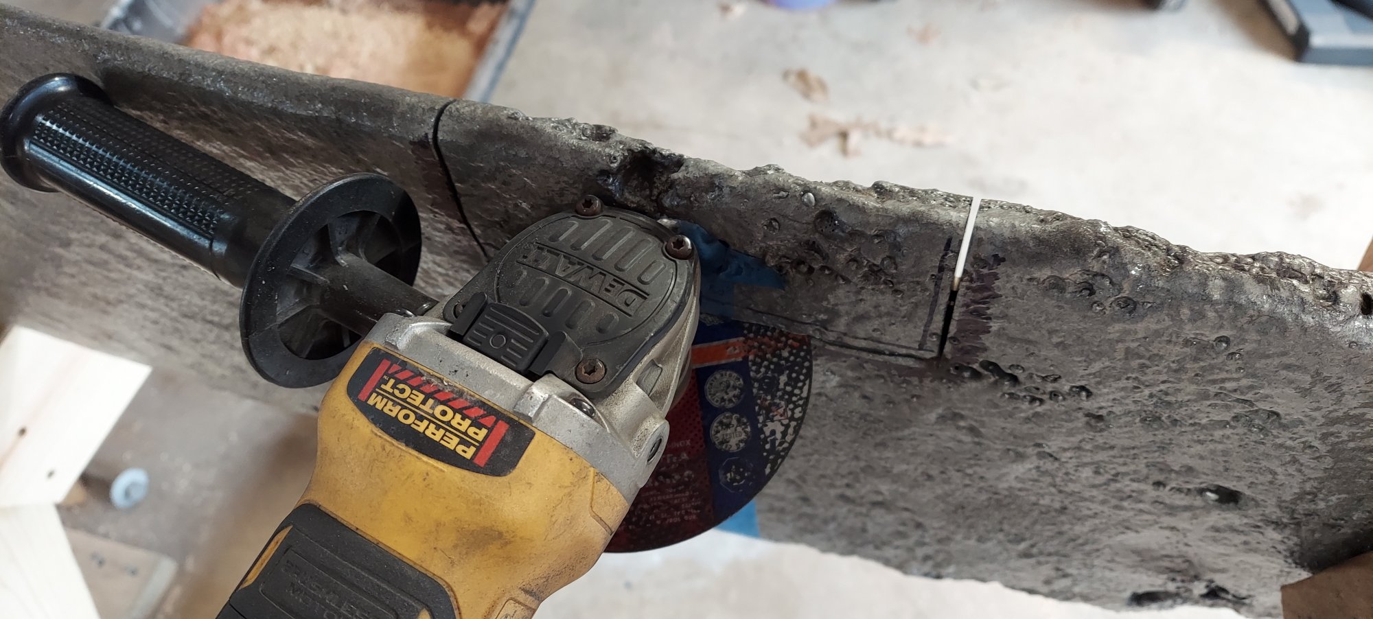 -An angle grinder with cutoff wheel did the plunge cuts, and a reciprocating saw WITH BLADE SPECIFICALLY FOR IRON finished the cuts. Do not use blades for steel, you'll burn them up.