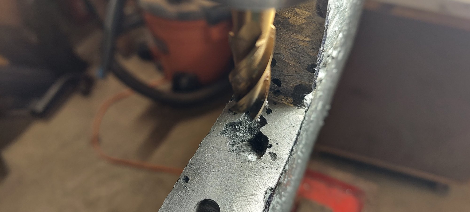 -It was easier to move the drill press to the keel, much much lighter. 4 pilot holes were drilled then hand tapped.