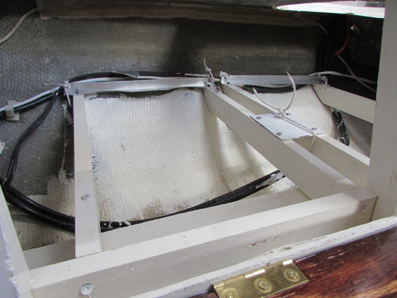 Getting ready for some summer one week camping trips and my wife and I mostly live out of three 18 quart plastic bins. Two of these bins have been stored under the starboard seat. Many years ago I used an idea I got from Timebandit that has worked out very well and that is to make the seat cushion with a plywood bottom, foam on top and then the cloth just stapled to to the plywood (first picture). This has been trouble free for many years. But.. since we typically get into the plastic bins at least once per day (sometimes more), I have to lift that seat up every time so I wanted to improve the ease of access to the plastic bins.