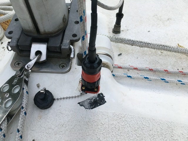 Today I finished installing a new compass and deck connector for the masthead light. The compass replaced the identical model, so I didn’t have to worry about recutting a hole. I was planning on bolting throughThe bulkhead, but went with an alternative method, taking a cue from Hunter. I used epoxy putty to secure pieces of aluminum between the cabin liner and the cockpit bulkhead, which I then drilled and tapped, to screw the compass to. I tapered a 3/4” thick piece of HDPE to put behind the compass to align it with the centerline of the boat.