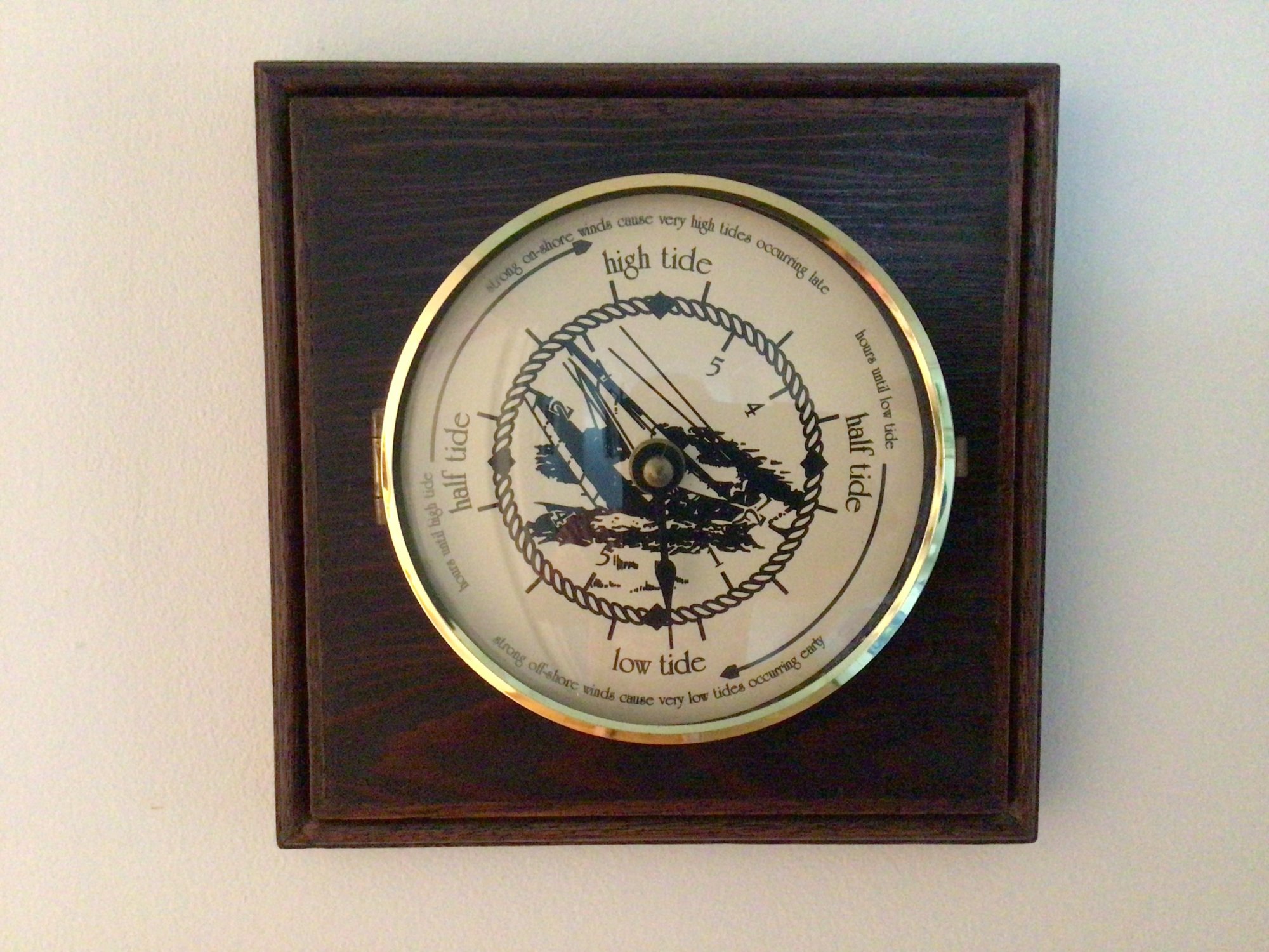 It's amazing to me that even for a tide clock, a cheap Chinese quartz movement is available! All the value of these is in the case, the dial, and the name. I got mine on eBay. There's corrosion on the brass, under the lacquer, but I'm just going to leave it, and call it patina.
