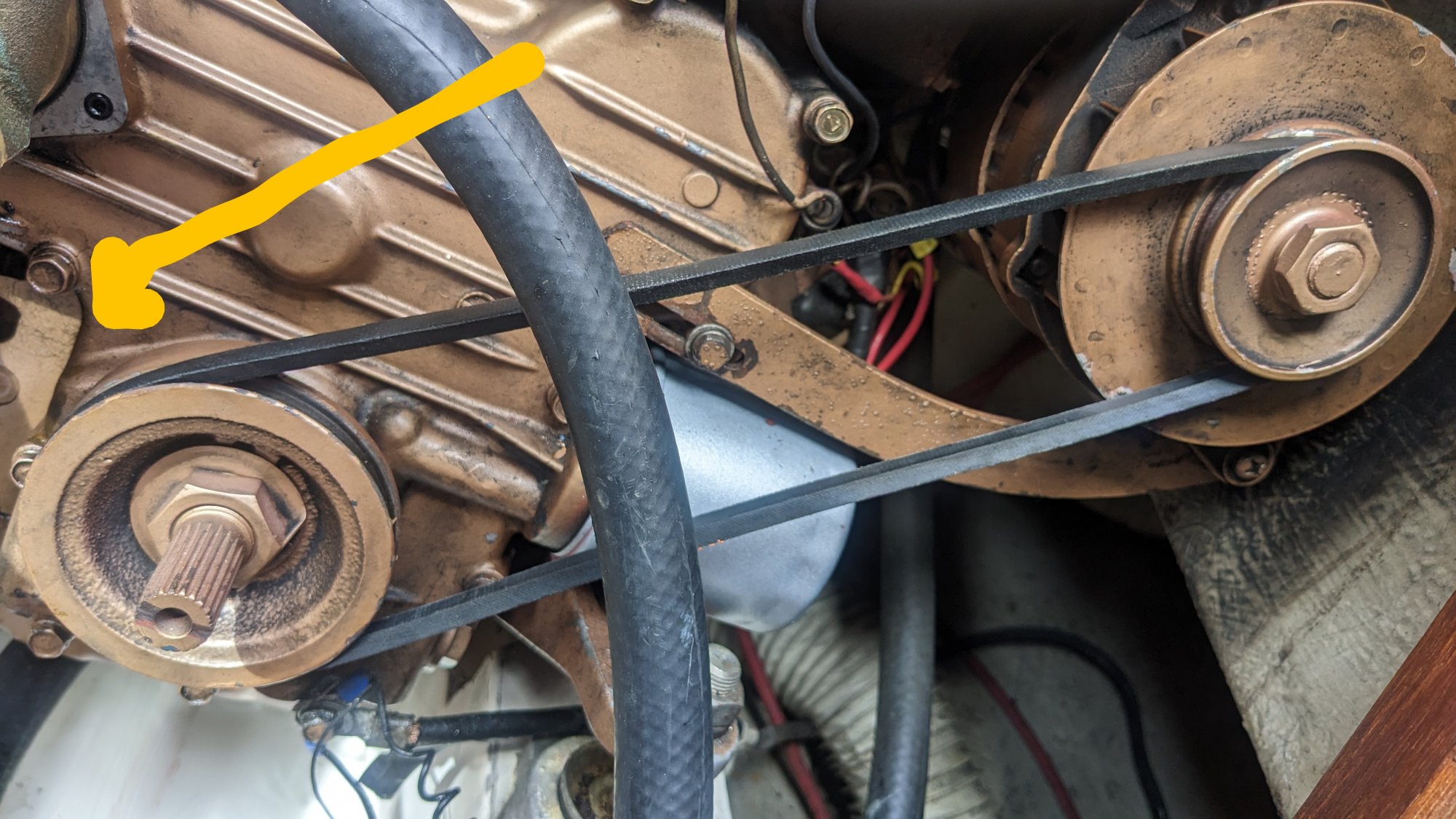 I have trouble tightening the engine belt on this engine. The belt is adjusted by the highlighted bolt and it seems no matter how hard I push on that alternator on the bracket to slide it over I can't get enough pressure on it to tension the belt properly. Just wondering if anyone had any tips, homemade jigs, prayers or voodoo magic to tighten it up? It must be a common issue.
