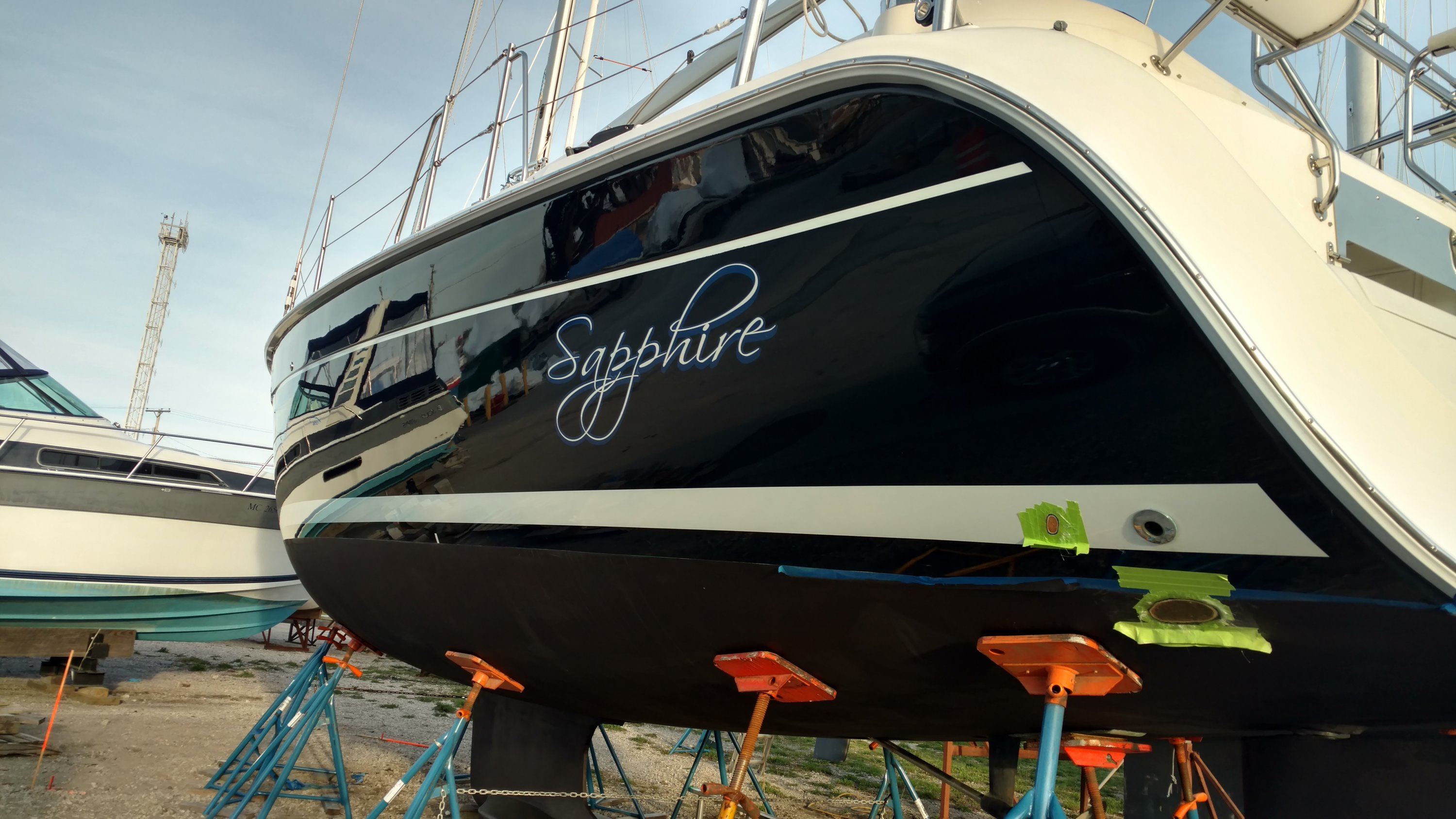 No fair using your mirror of a hull to show the black streaks on the boat next to you.Fours days of buffing and waxing with products and sequencing as recommended by MaineSail to arrive a near perfection, have a couple of repairs going on here which were completed today