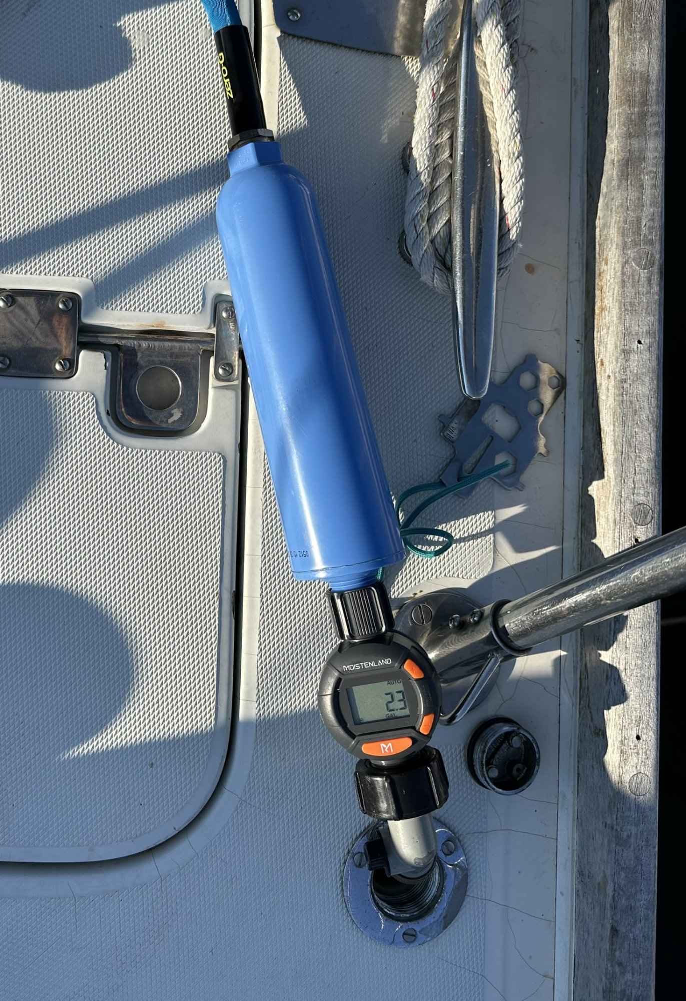 My C30 has a couple of tanks, both of which are only around 20 gallons. filling until the water comes out of the vent is easy and accurate and only requires that I do not push the hose down into the neck. With the hose draped over the lifeline so that it is self-supporting, I can sit inside and listen for the sound change that happens just before the tank is full then go up and either change to the other tank or shut it off.