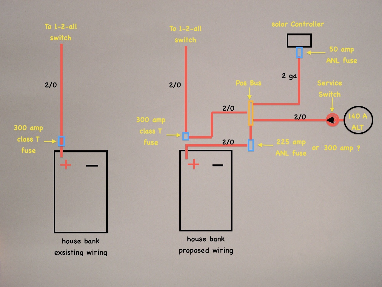 I am trying to avoid stacking too many lugs on one battery terminal. I am looking for assurance that what I am about to do is the right way to do it. Battery bank consist of 5 Lifelines GPL-31T. With the batteries hooked in parallel and the house bank feed fused with 300 amp Class T fuse. Starter bank has its own lead and 300 amp Class T fuse. Both run to the 1-2-all switch. I will be running 140 amp alternator to house bank and solar controller output to house bank as well. Problem is I don't have enough existing 2/0 cable from house feed to run to a new fused bus bar to avoid stacking more than two lugs on a battery terminal. My thinking is to take house feed from positive side of battery and connect to bus bar. Then run new 2/0 cable from positive battery terminal through a 225 or 300 amp fuse either ANL or a terminal fuse block from Blue Seas to bus bar. The terminal fuse block kinda defeats the purpose because now I am stacking more than two lugs on a terminal. So would this be the correct way to do this? Second question is do I go with a 250 amp bus bar or do I need to go with the 600 mega bus bar. All wiring meets ampacity ratings and voltage drop is below 1% drop except alt. run which will be close to 1.5%. I realize that this diagram is very basic. I just want to help clarify my intentions.
