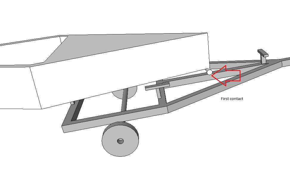 At the boat ramp the level boat is making contact with trailer stop at ramp angle.