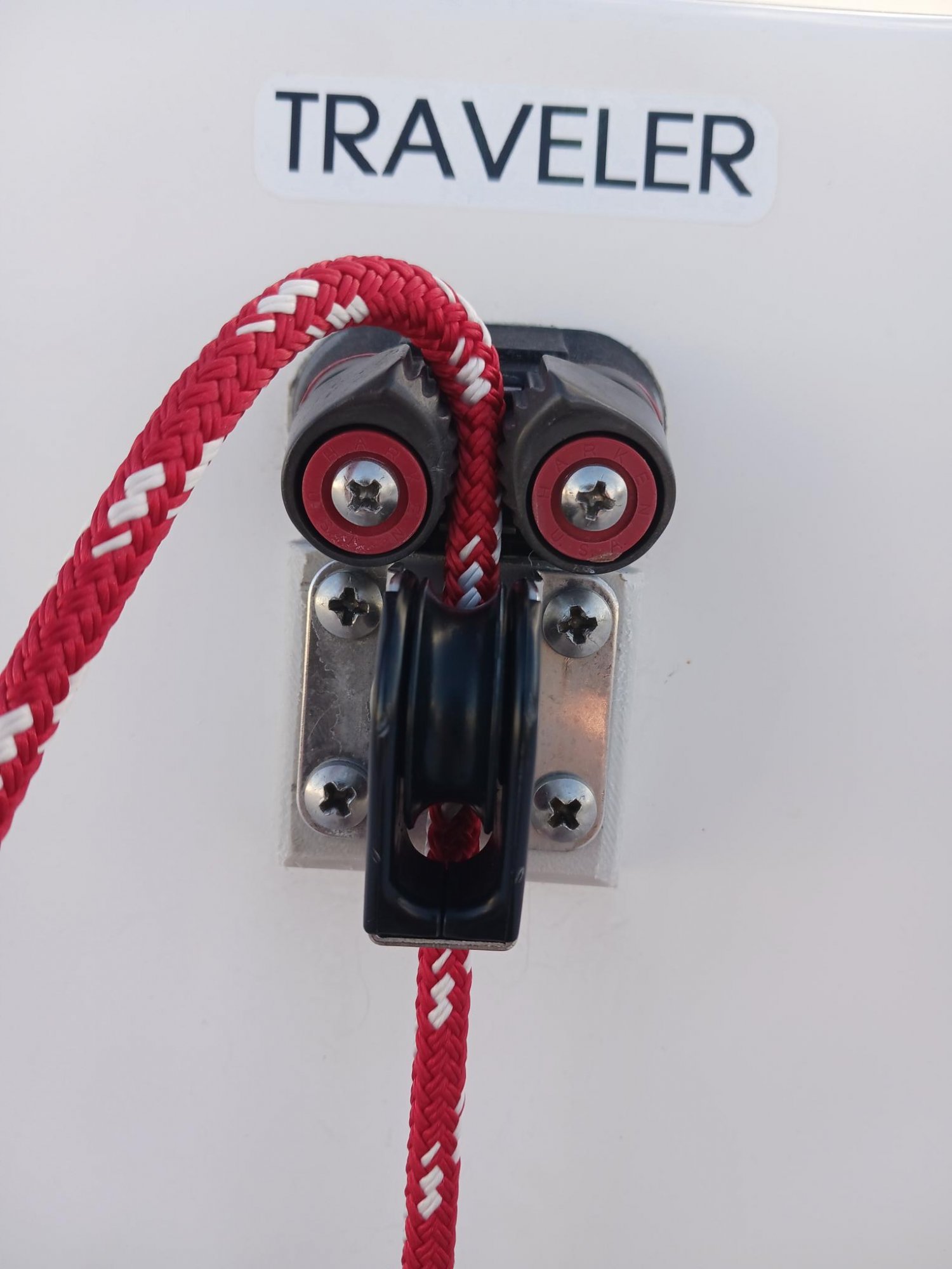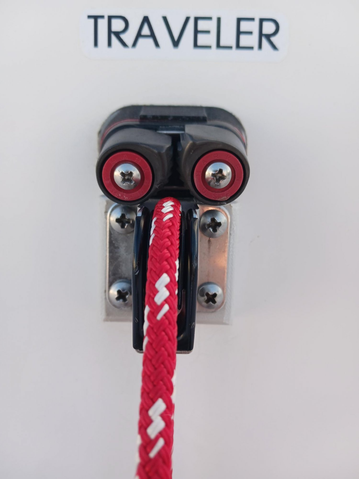 I wanted to eliminate the friction that was being caused by the part of the cam cleat that captures the traveler line. So I removed that part, and mounted a Harken block under the cam. The line is still captured, and it's much easier to release and move the mainsheet from side to side. Just make sure the new mounted block has enough clearance so it does not interfere with the cam operation. Sorry I didn't note the name/size of the block, but it was an obvious match when I shoped for one. Yes, the label is on the boat for new crew members, as are the labels for the clutches, etc.