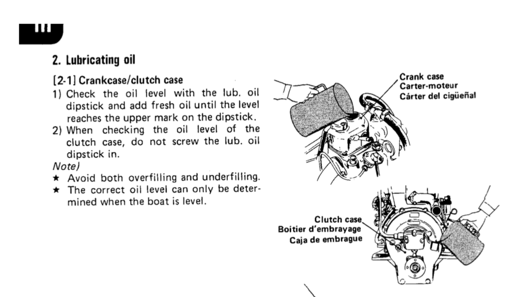 My thoughts are to put more oil in so it reads at the middle of the dipstick. As long as there is no more oil in the bilge, I should be go to go. Does anyone have any other ideas? Barring any obvious leaks, my next step will be to remove all the oil and ad the 3 1/2 liters that "owners manual" reads. I use quotes, because I have no way to verify that I have the right manual.