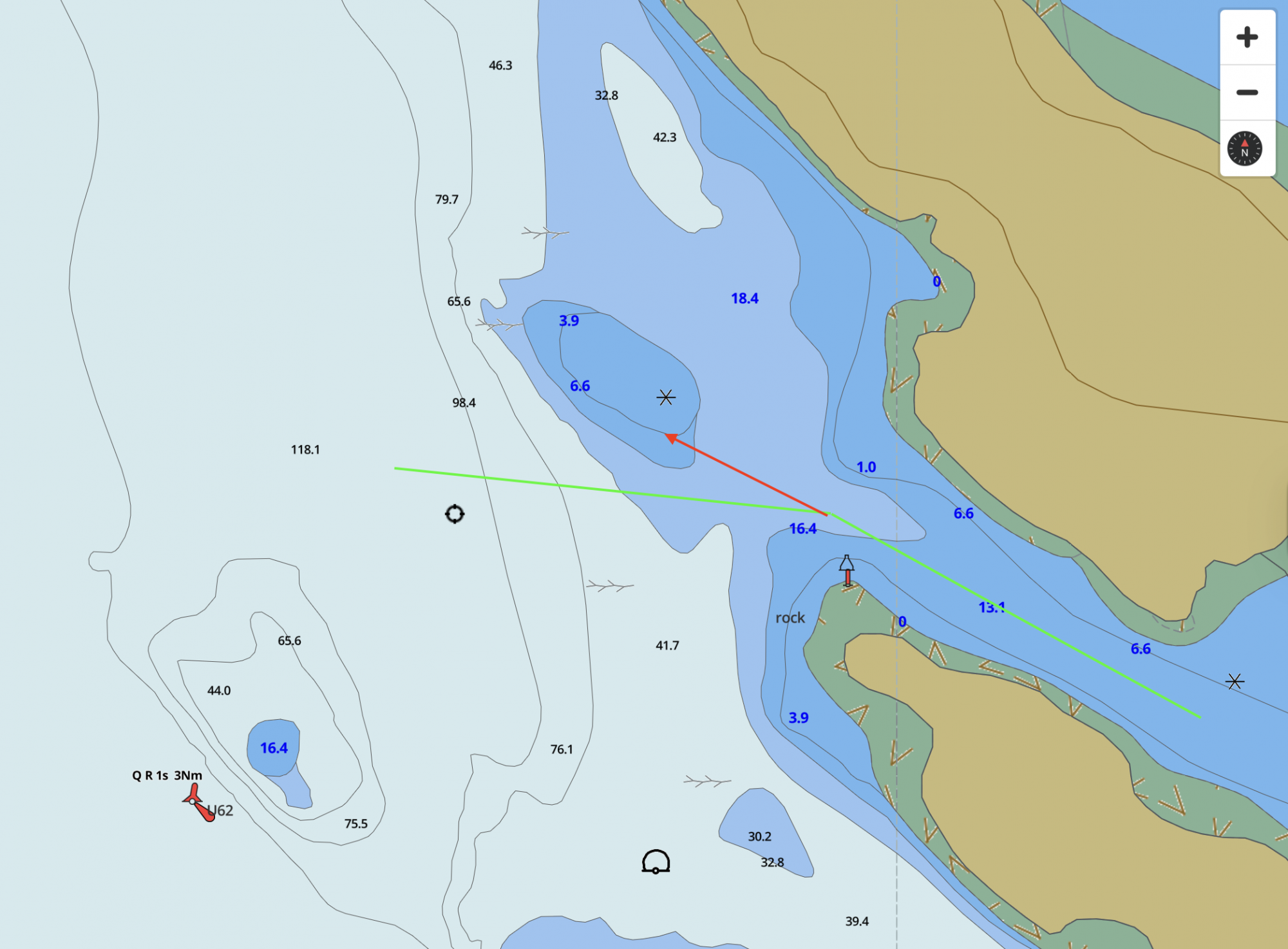 Upon recreation, my course must have been along the red line. The tide was out, so the 6.6 ft of clearance was not a reality.