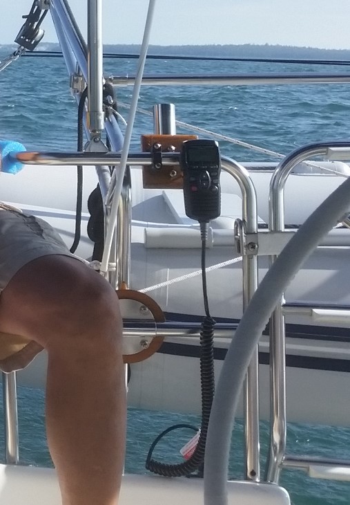 Thank you so much! If I have the right radio, this will be the best solution for me for the short term (and a handheld).Honestly, I think I read @AaronD 's write-up before I did mine, but the instructions are pretty clear. Installation is plug-and-play with no splicing needed for my installation, if you run it in the right direction and remember to put the stuff on before fitting together. On my Cat 36, I could not figure a place on the binnacle to mount it that kept the curly wire off the deck but was still a couple feet away from the magnetic compass. I had just pulled an old GPS antenna off the stern coming, so I enlarged that hole and installed there, mounting the mike holder on the stern rail. It took some boat yoga to run the wires up front. They give you about 20-feet of wire with the mike, so usually not a problem, but you can buy an extension cord as well. Plug one end into the back of most SH radios, and the other end into the bottom/back of the mike mount which was mounted over the hole with a bead of LifeCaulk to avoid leaks. The mike unplugs from a 9-pin connector, and you should have the radio powered down before connecting or disconnecting it. Best photo I can find of location: