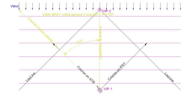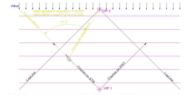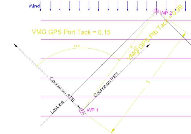 Notce that at point 2 you have not yet reached the layline (the line at which you can make it to the mark on one tack). It is evident that you must reach a layline to reach waypoint 2. Your VMG to each layline is the same as your VMG with respect to the wind. If a tack costs nothing then you can tack as often or as little as you want within the two laylines without affecting the time it takes you to get to waypoint 2. In effect, your veloctiy made good to the top mark is the same as your VMG upwind anywhere inside the laylines. But, that isn't what your GPS will report.