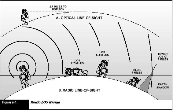 The line of sight distance is 10 miles to the horizon. An antenna on a masthead 20 miles away can just see your masthead at the horizon level. This works unless you are member of the Flat Earth Society in which case LOS is infinity.