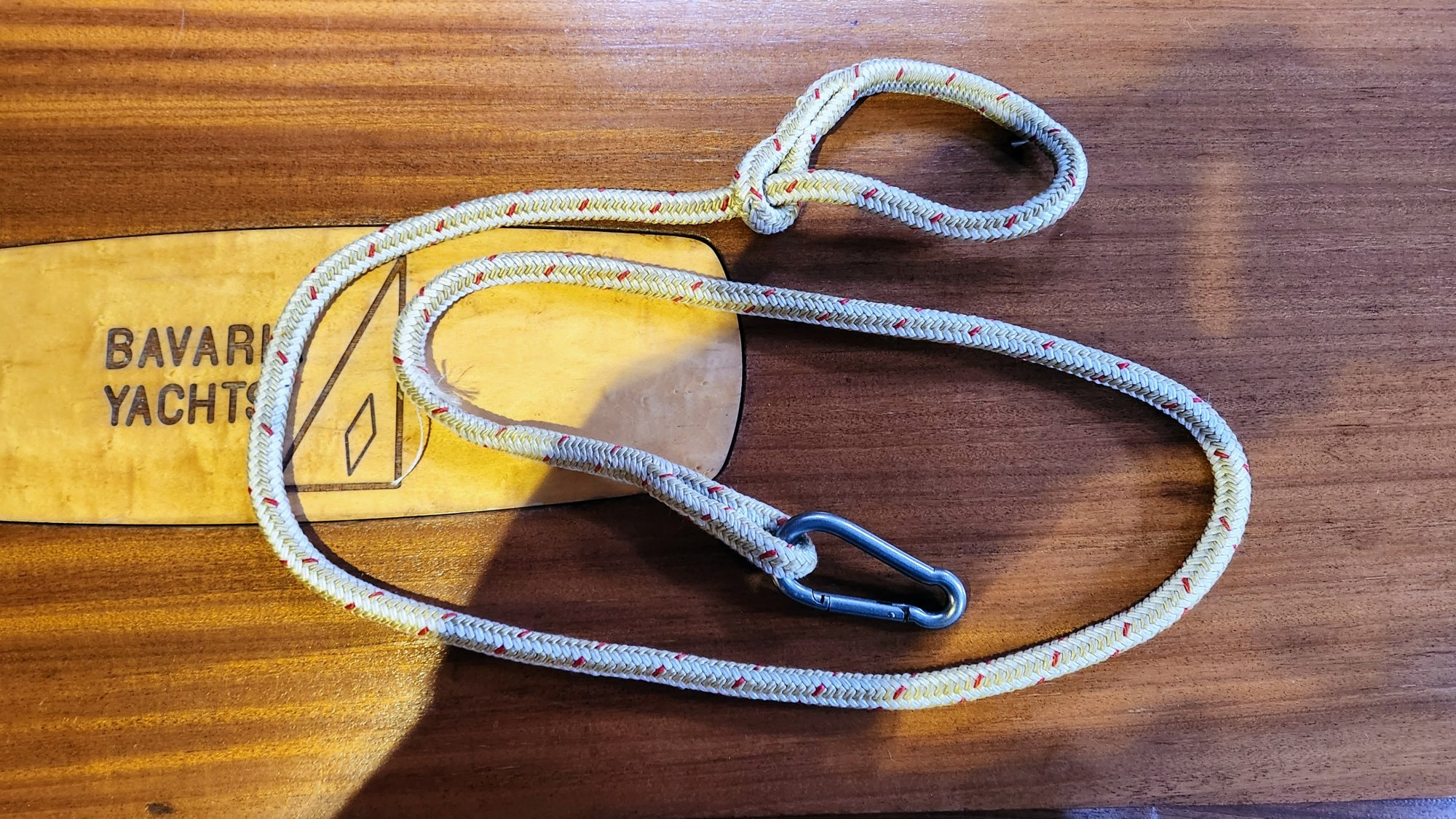 Makes sense as there is also a harness that is onboard. Only thing we don't have is a jack line. I suppose it could be used to tether the helmsman to the binnacle.It is a really bad idea that was once employed as a tether for a harness. The bad idea was there was no way to easily release the tether from the harness if you were being dragged along side the boat. Also, the carabiner could snag on the pad eye and inadvertently open rendering the tether useless.