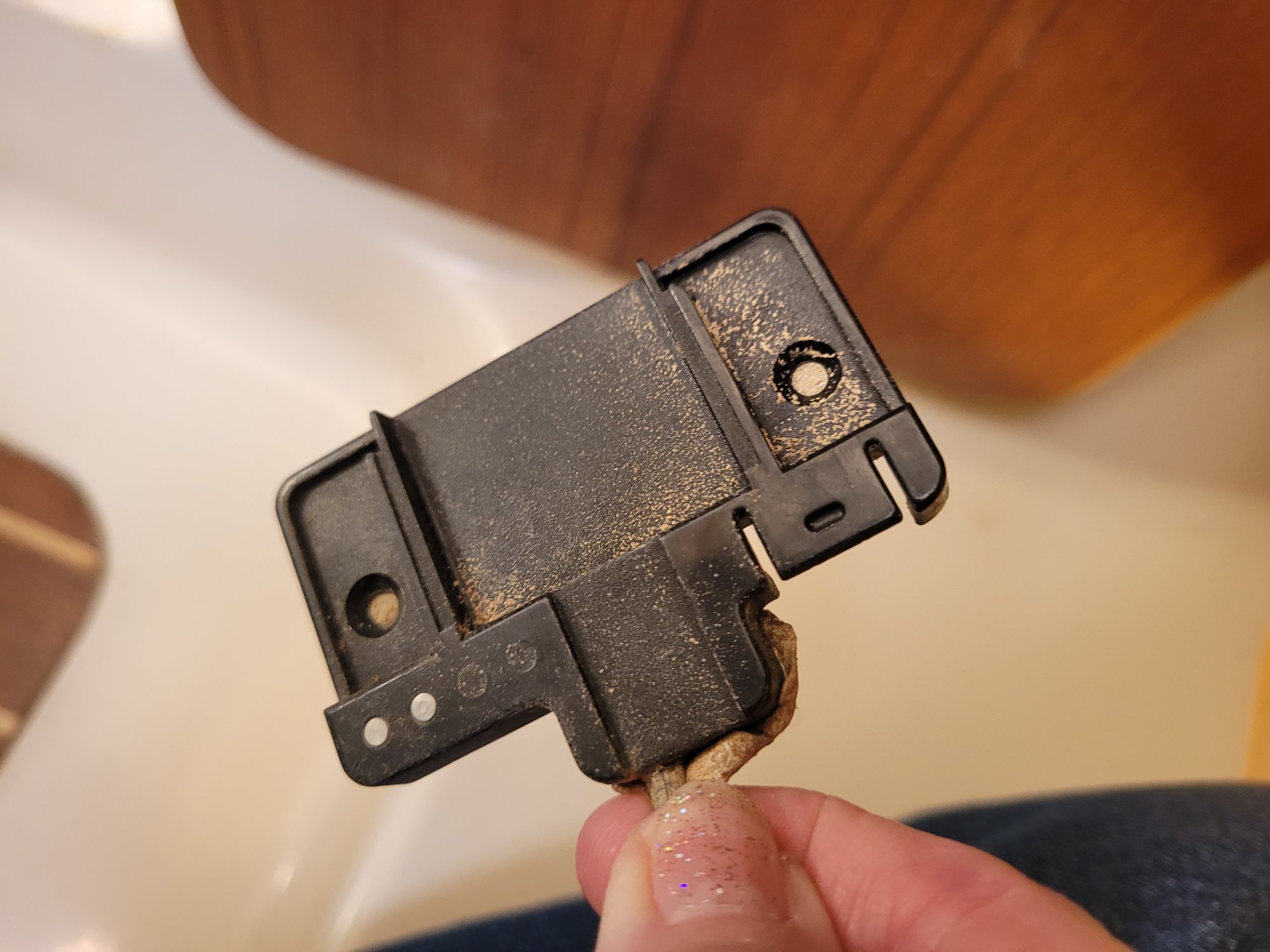 One side of that object has countersunk mounting holes for flat head screws. The other side has a fuzzy or brush like surface that covers the entire bottom and the mounting holes. The top side with the screw holes visible has what appears to be two electrical contacts. My guess is that the bottom is velcro or some similar means of attachment to the bilge bottom instead of the screws. The top probably had some kind of snap on device maybe for batteries. Send photo of other end if possible. Love puzzles.