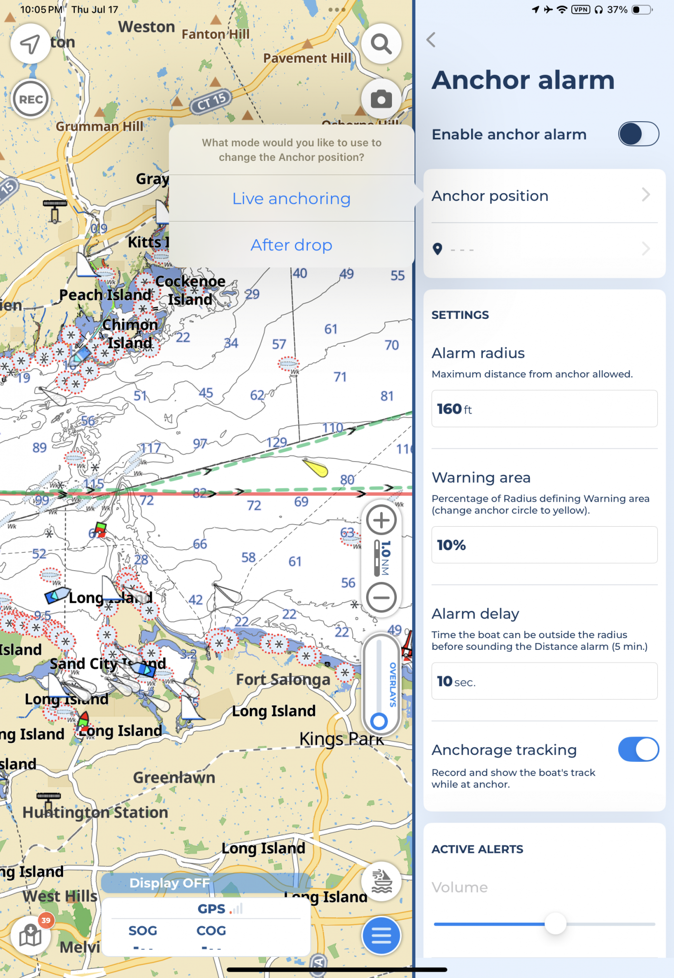 Start using the anchor alarm function, then to set anchor position choose either live anchoring or after drop. You can then set (and edit) position, bearing, and distance. (No GPS position in the attached screen grab). No swing angle limit - you are setting a radius from the anchor position. If you‘re concerned about wind shifts you can set the anchor distance to be closer than it is, and swinging out of that circle will set off your alarm.Where is the swing angle? I couldn't find where to set that.