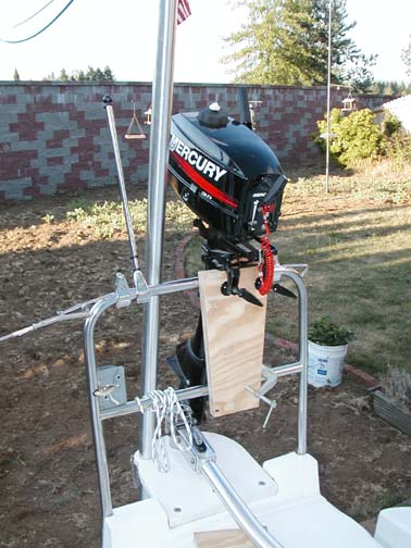 I have been planning on placing a motor mount on my starboard side cockpit pulpit rails for my dingy motor. However, while building the mount, I purchased the Hunter bimini and mounted it on the stern rails. Guess what!!! The bimini support tubes go right through where the dingi motor would sit. I'm now trying to figure out a good secondary location to mount the dingy motor. The bow pulpit doesn't have enough railing to properly hold the motor or its mount, so I'm looking at the stern midship railing right above the tiller and rudder. But the outboard motor has to be swung up to keep from hitting the rudder post (see photo). My question is, does anyone have a better suggestion as where to store their dingy motor. I hate to keep it on the dingy and pull the extra weight and I often don't inflate the dingy until I get to my destination. I've been laying it under the cabin table, but it's always in the way. Suggestions...please.Brigg