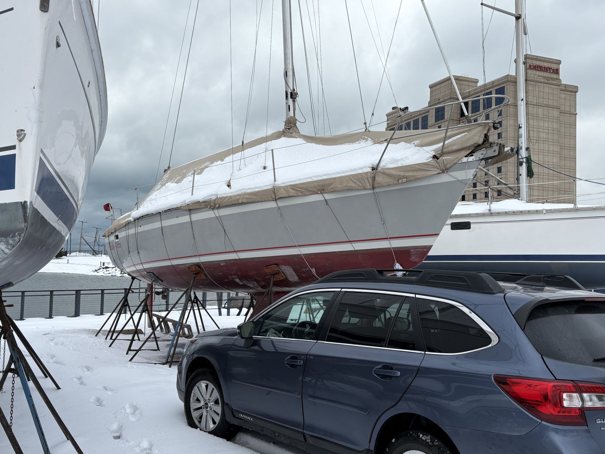 Yes, it’s awful for the boat to leave it uncovered but tarps are worse. They constantly move from the wind and scuff and scratch the finish - whether paint or gelcoat tarp damage is worse for the finish than ice and snow damage. You’ll spend days compounding to bring it back, and every cycle of compounding makes the finish thinner. As a multihull owner since 2001 wintering boats in CT with either no covers or incomplete covers - I know the freeze-thaw toll is not as bad as many people would think. Your boat doesn’t have much wood, and that is key. The other thing that’s key if uncovered is to be able to shovel out the cockpit after every snow because the skuppers will freeze solid and you must prevent meltwater from entering the interior of the boat. A toddlers plastic-edged small snow shovel is ideal for this.