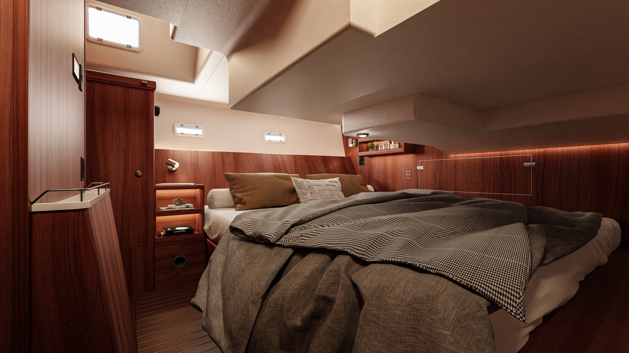 I am planning this April to remove the headboard and two seats in our 2006 Hunter 38 and extend the bed area to the starboard wall, and add a side table where the starboard chair is. This is a design to allow for a larger bed, and also make better use of the higher headroom that exists starboard. The new bed will be an unusual size - 71" wide and 85" on one side and 75" on other. This design basically copies what Hunter did with the aft cabin in the very similar later Hunter Marlow 37 aft cabins. I plan to order a custom mattress to fit the new space, and make a headboard, side table, shelf on wall, and new smaller engine cover (to allow space to still walk to head).