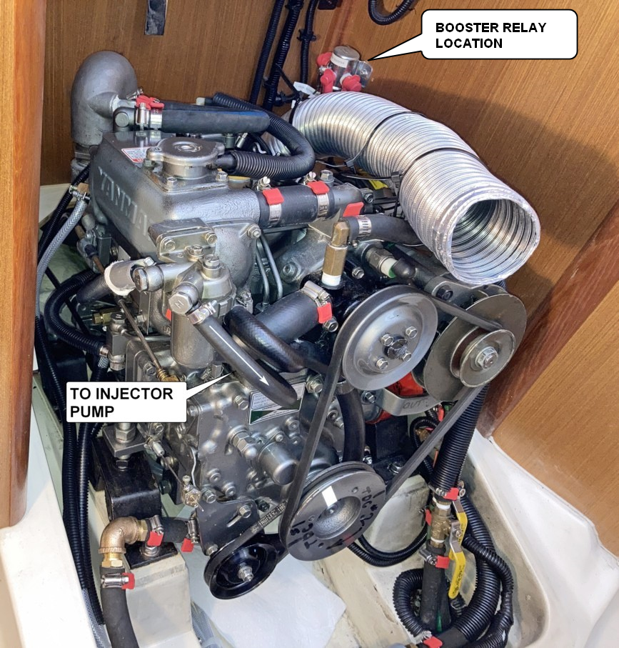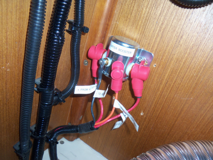 The reason for installing a booster relay is to avoid the complication of running heavier wire from the starter button down to the engine starter solenoid. All wiring is localized at the engine and within 2 ft. This relay is mounted on the bulkhead beside the engine.