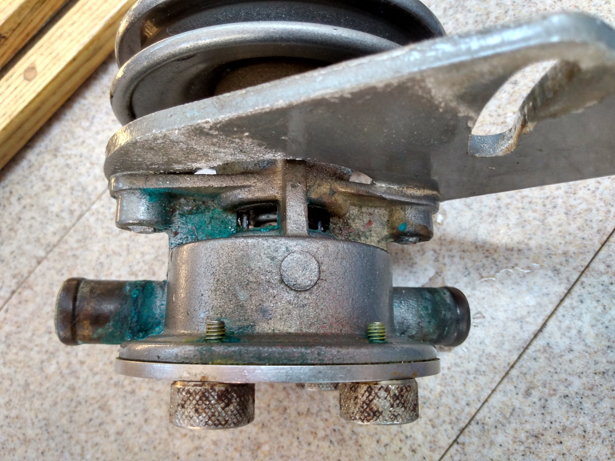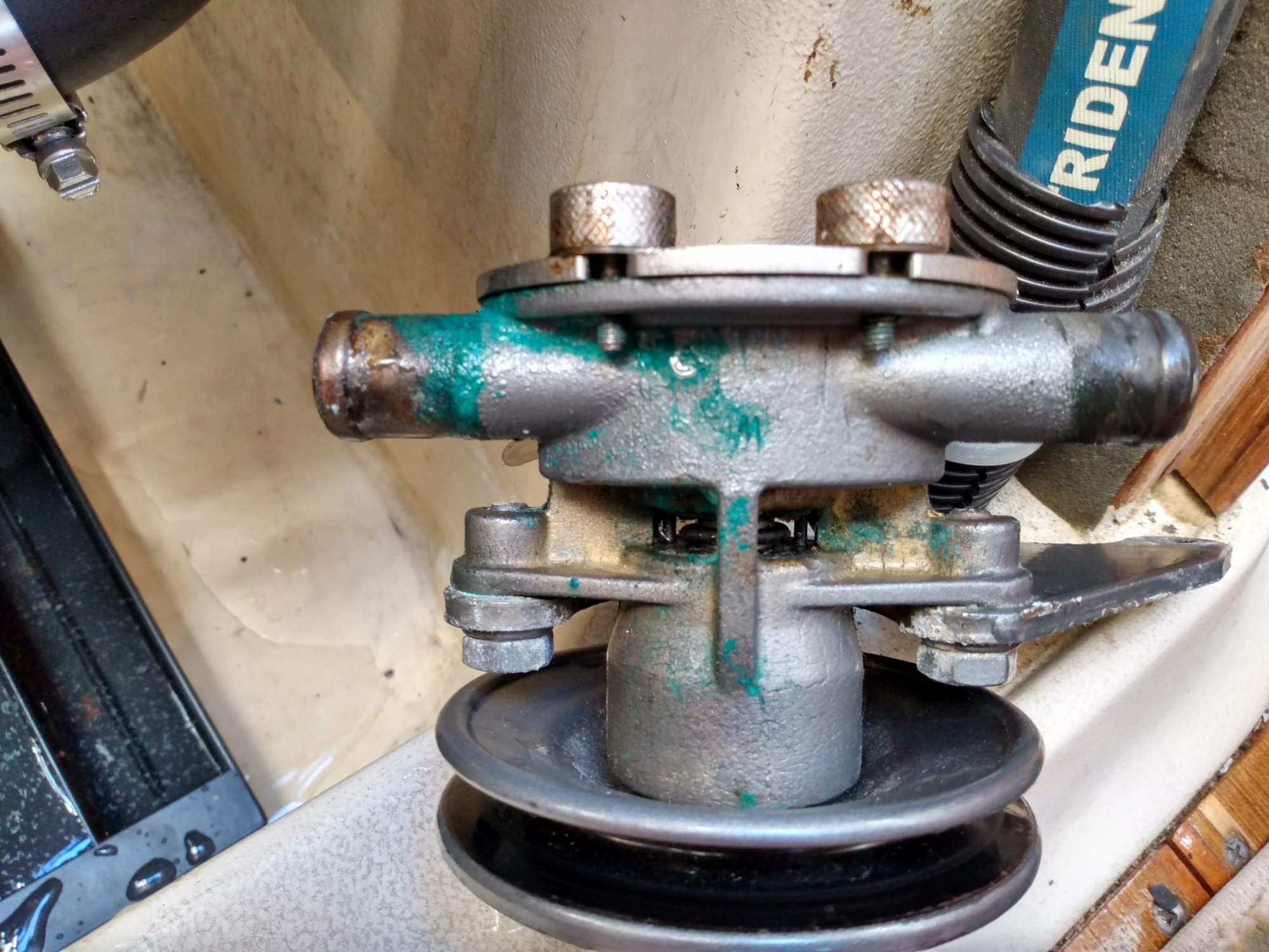 My 2000 Yanmar 3GM30F Engine needs a new Raw Water Pump. It has a drip coming from the center of the pump housing. It’s not a gusher but needs to be replaced or rebuilt. You may not see the drip from my pictures but it’s there. The green coating tells me it may have been there a while and just didn’t see it. It turns into a spray while the engine is running. I can see it but the camera can’t pick it up.